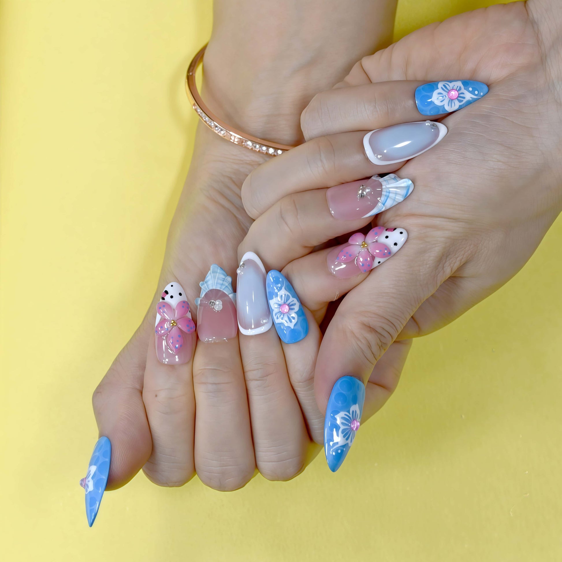 A vibrant mix of ocean-blue, blush pink, and playful butterfly accents. This set features hand-painted floral art, 3D butterflies, and gemstone embellishments for a fresh, tropical vibe. The combination of bold blue and soft nude gradients makes this the perfect statement for any day you want to stand out.
